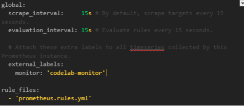 11. To make Prometheus pick up the above given new rule, add a rule_files statement in the prometheus.yml file. The config should look like below one: